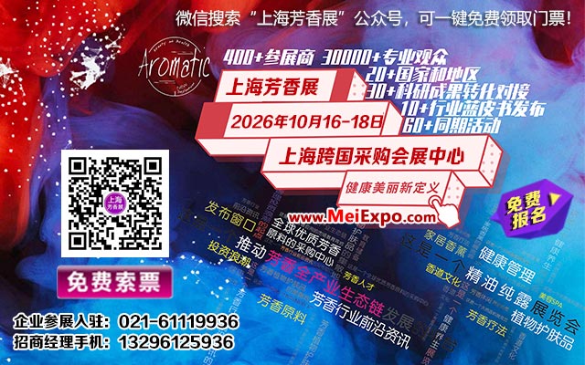 展會門票:在線免費領取,憑短信+刷身份證快速入場。微信搜索【芳香展】服務號,關注領取免費門票,可持續關注后續展會活動。